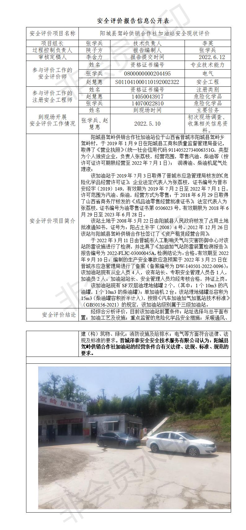 阳城县驾岭供销合作社加油站安全现状评价