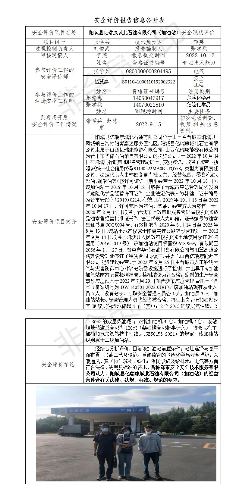 阳城县亿瑞康城北石油有限公司(加油站)安全现状评价