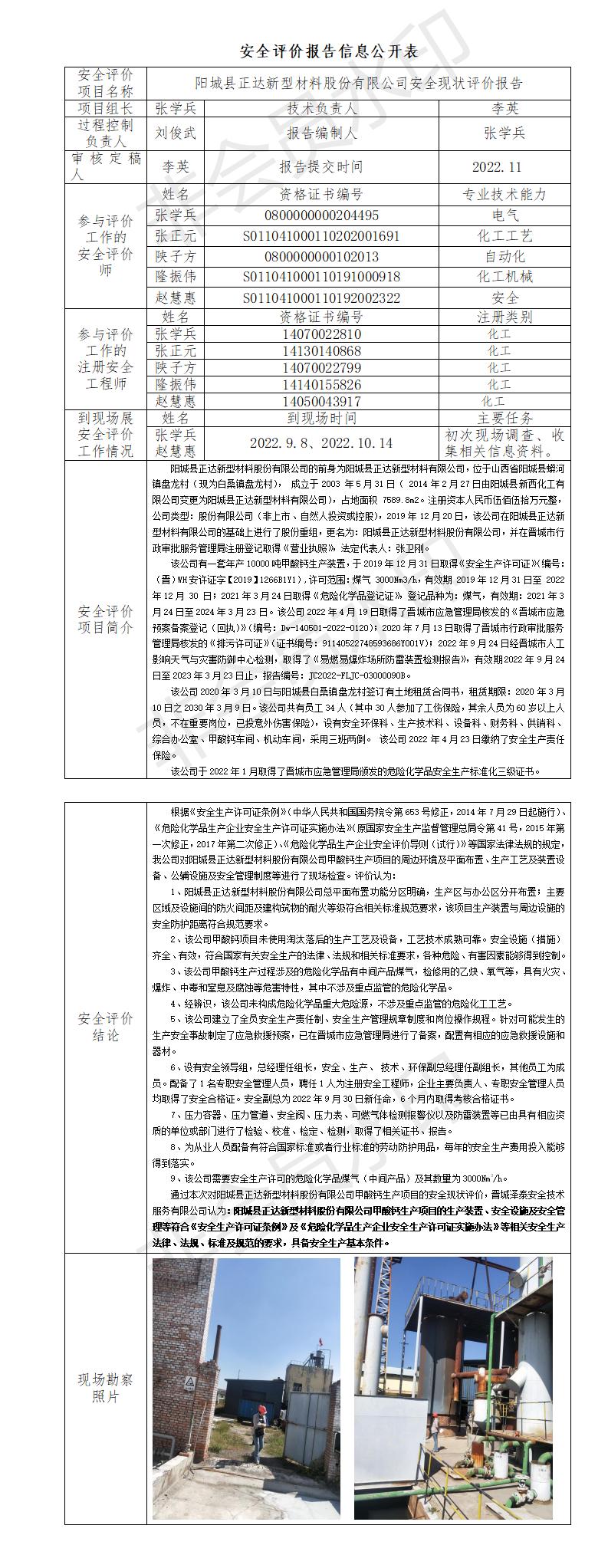 阳城县正达新型材料股份有限公司安全现状评价报告