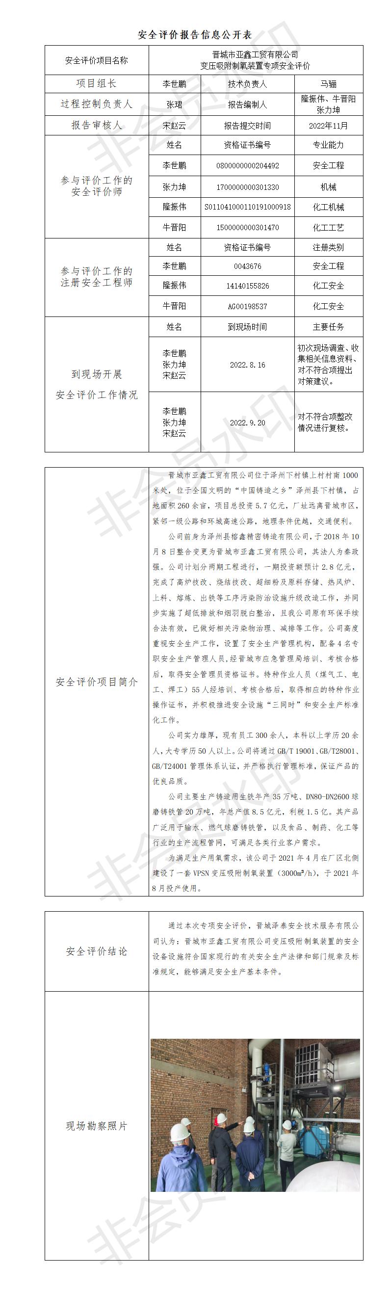 晋城市亚鑫工贸有限公司变压吸附制氧装置专项安全评价