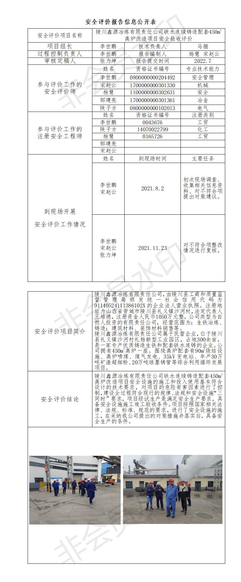 陵川鑫源冶炼有限责任公司铁水连续铸造配套450m3高炉改造项目安全验收评价