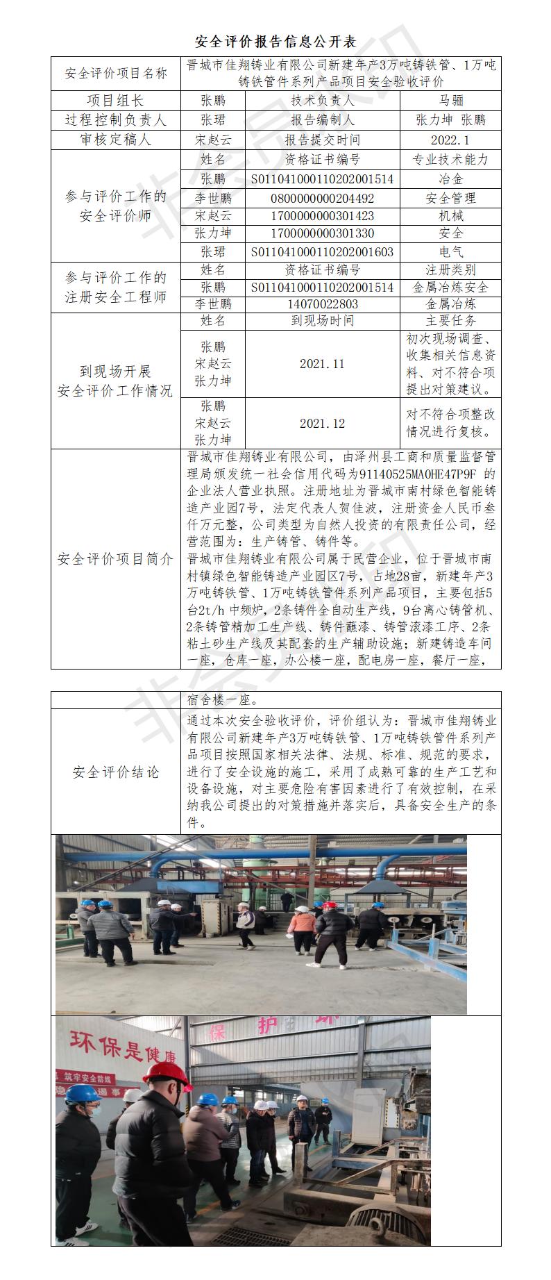 晋城市佳翔铸业有限公司新建年产3万吨铸铁管、1万吨 铸铁管件系列产品项目安全验收评价