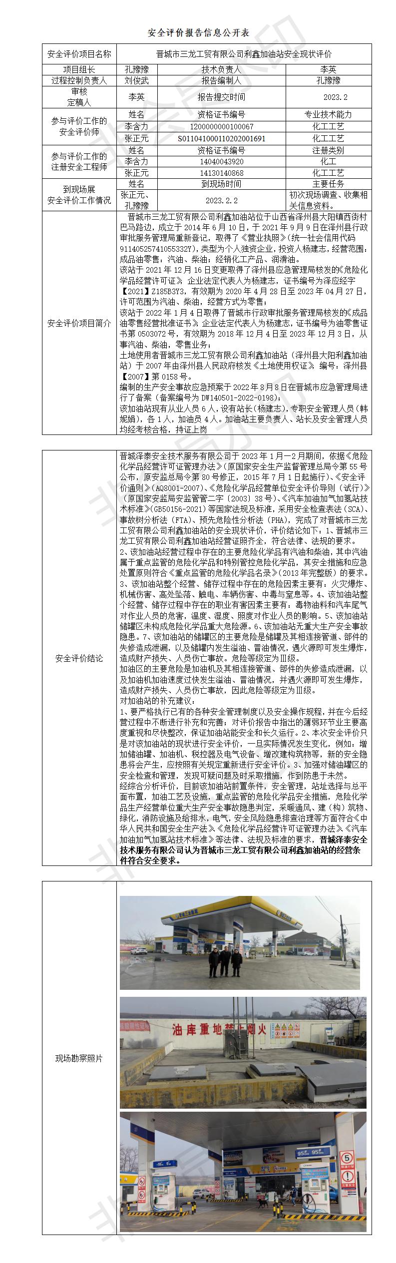 晋城市三龙工贸有限公司利鑫加油站安全现状评价