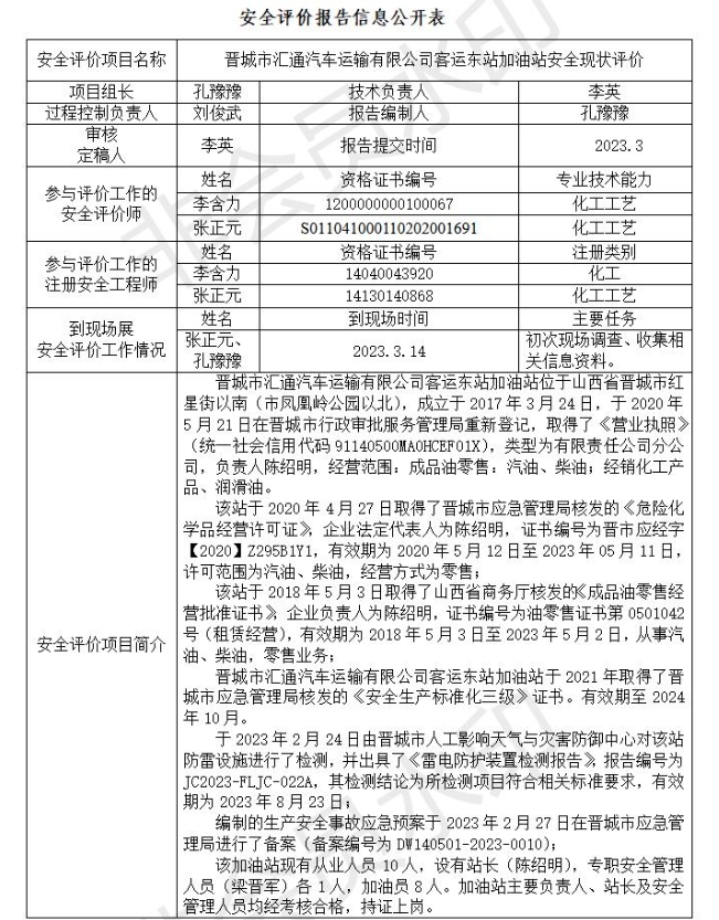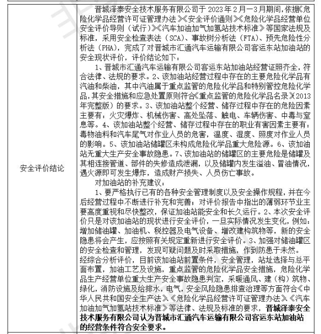 晋城市汇通汽车运输有限公司客运东站加油站安全现状评价