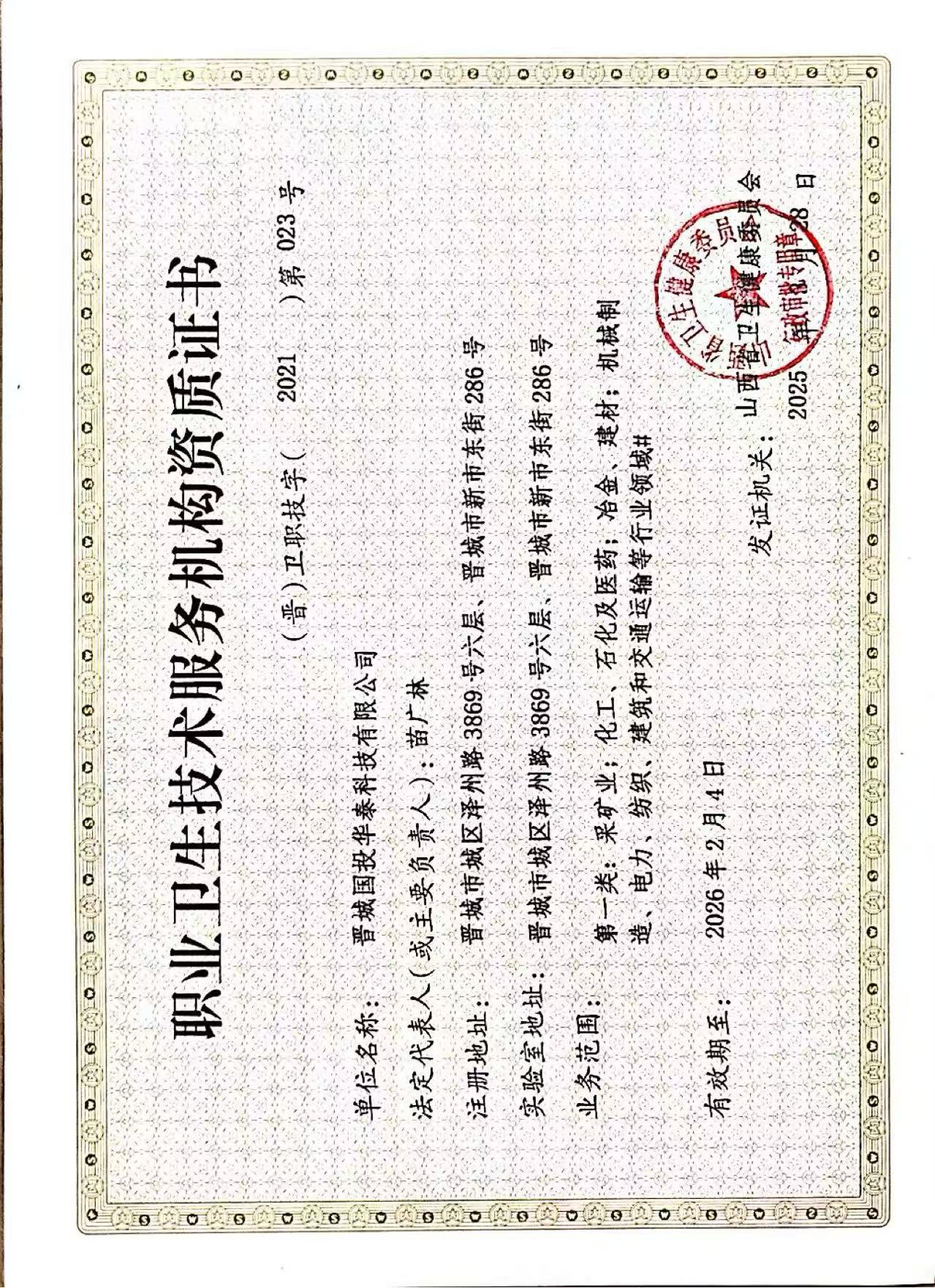 职业卫生技术服务机构资质证书